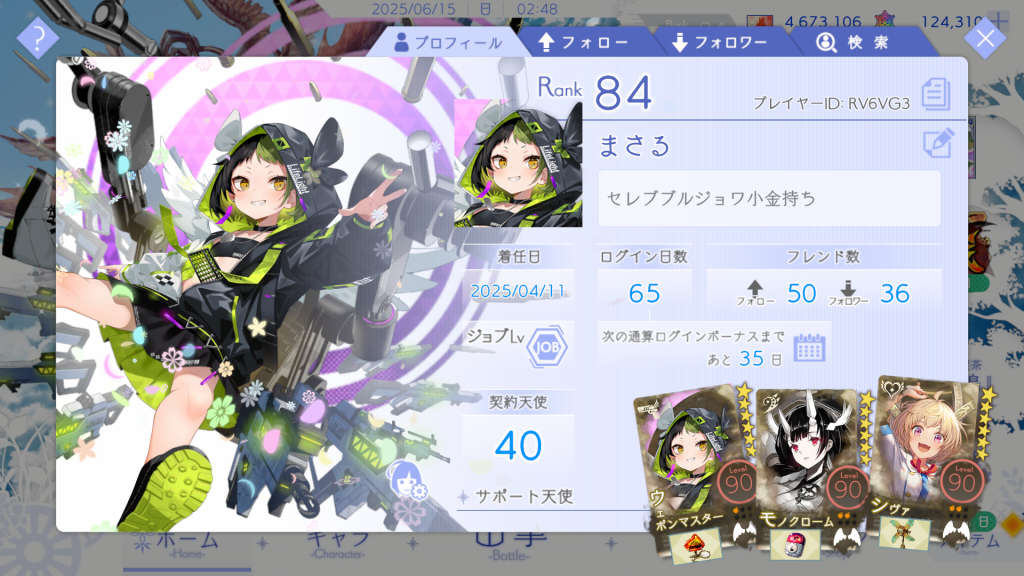 ゲームを始めたばかりであれば有用と思われる天使をサポートにしています。ポンマスちゃんのスキル3から無差別バレットタイムで、序盤はサクサク進めるかと。よければ使ってやってください。